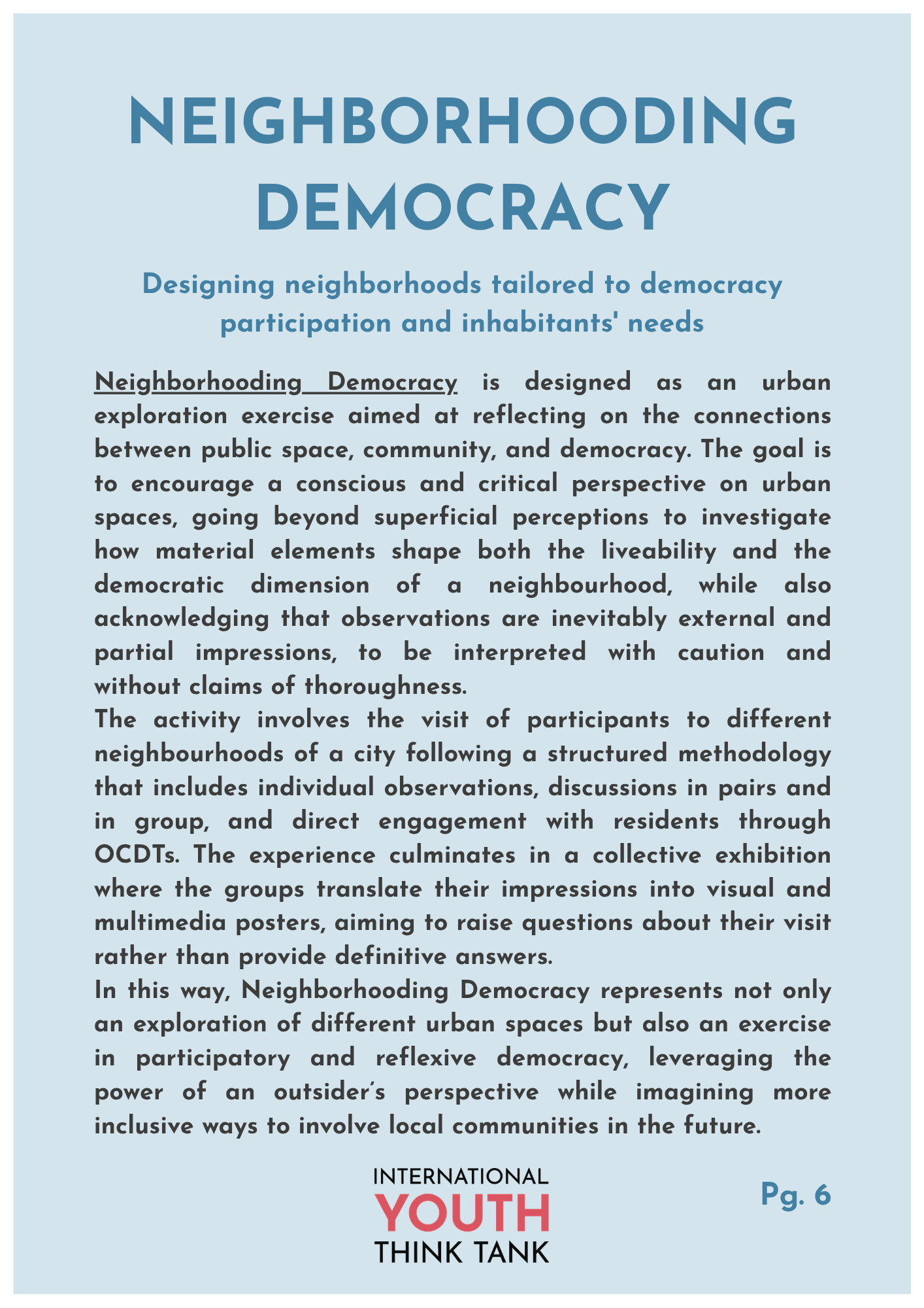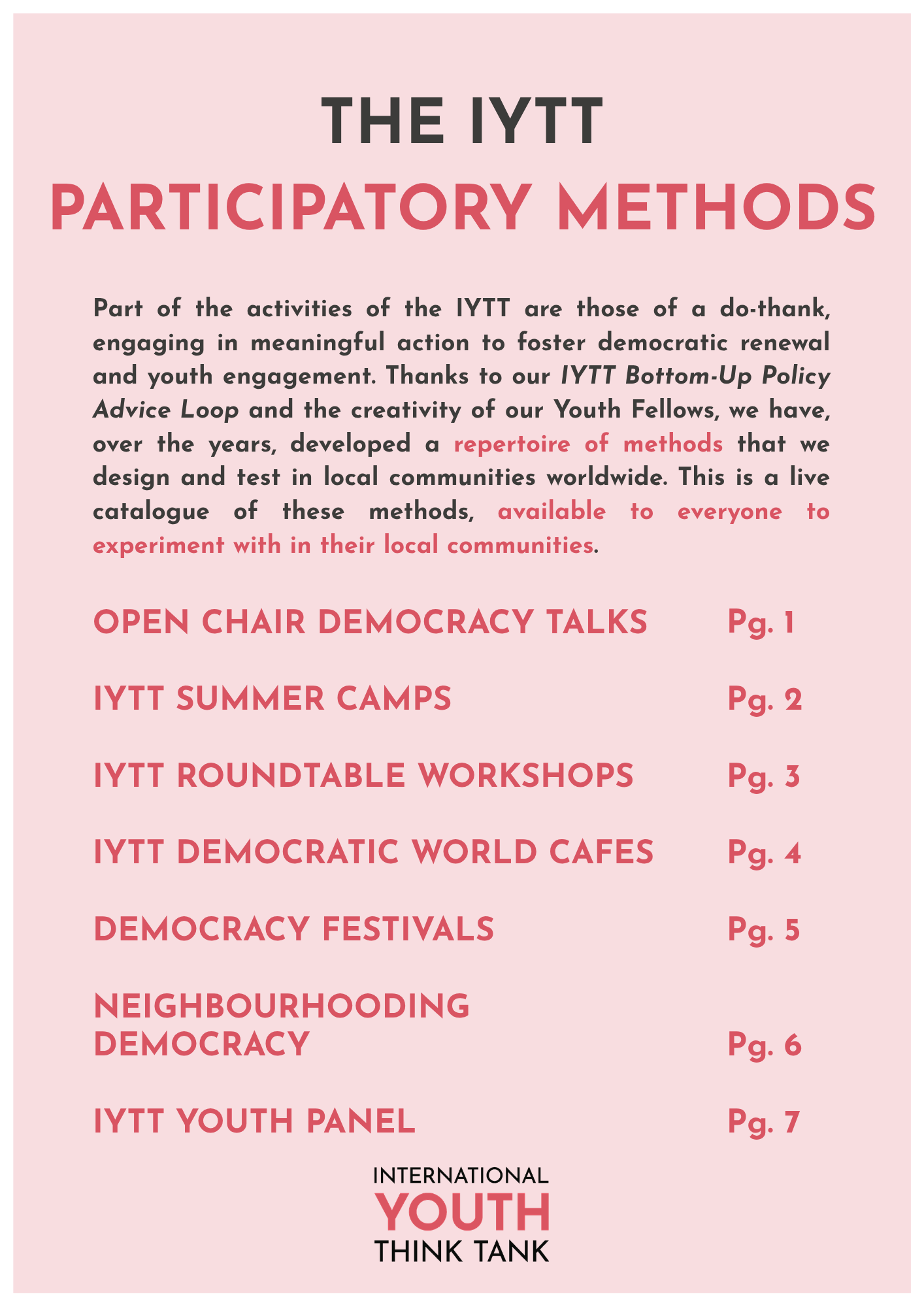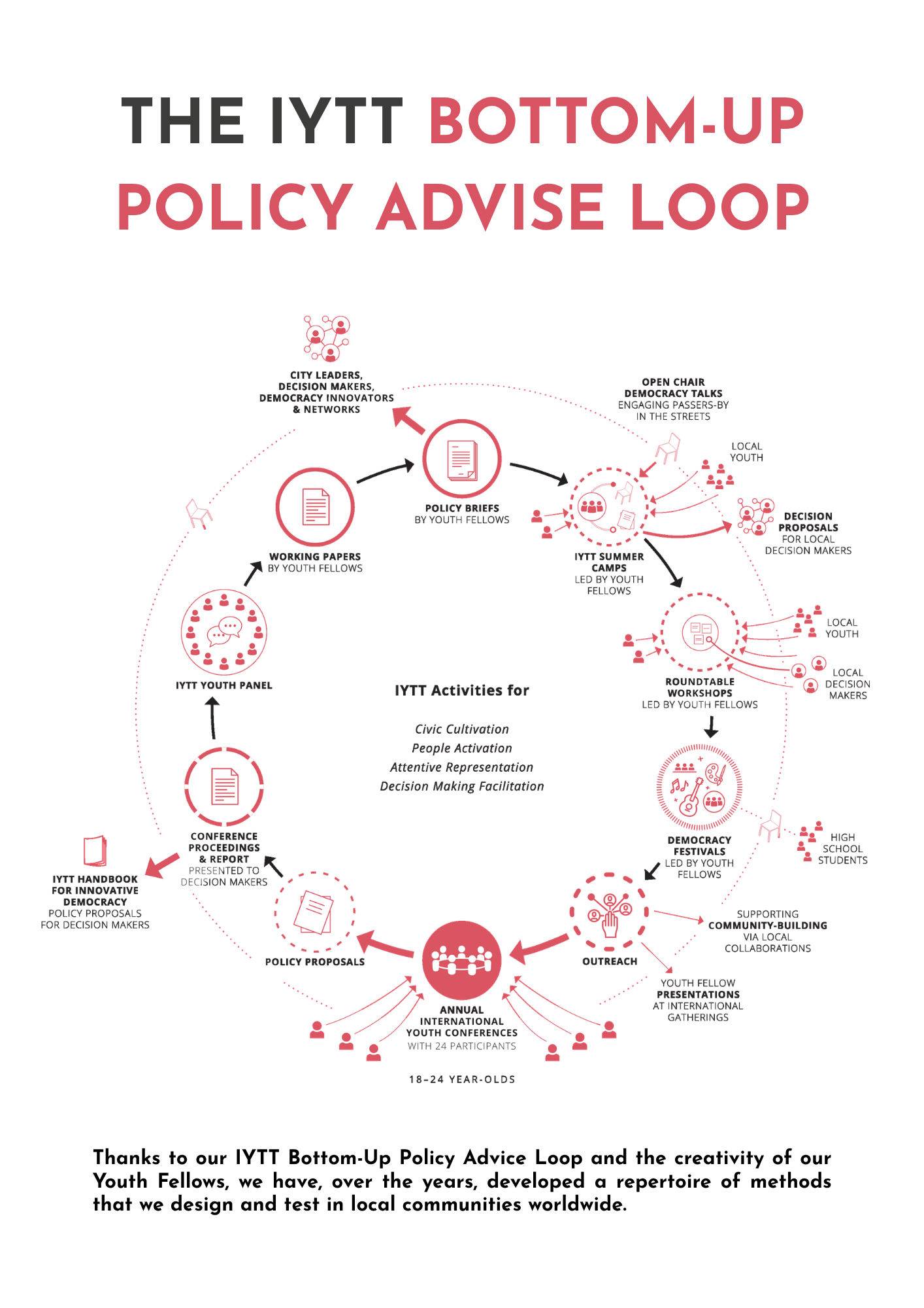 Part of the activities of the IYTT are those of a do-thank, engaging in meaningful action to foster democratic renewal and youth engagement. Thanks to our IYTT Bottom-Up Policy Advice Loop and the creativity of our Youth Fellows, we have, over the years, developed a repertoire of methods that we design and test in local communities worldwide. This is a live catalogue of these methods, available to everyone to experiment with in their local communities.