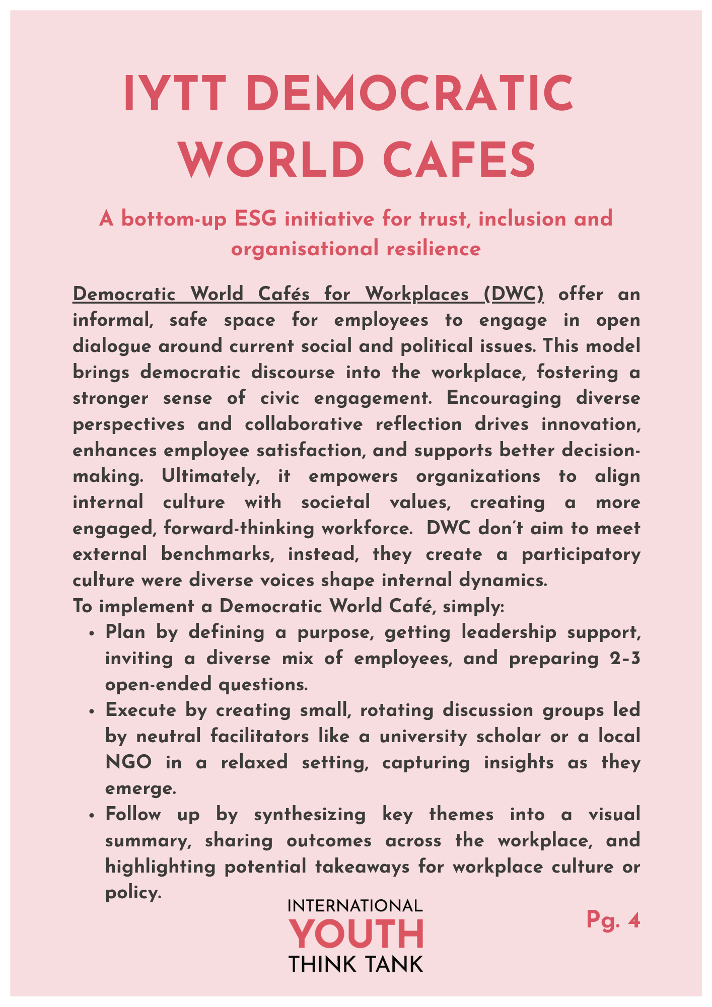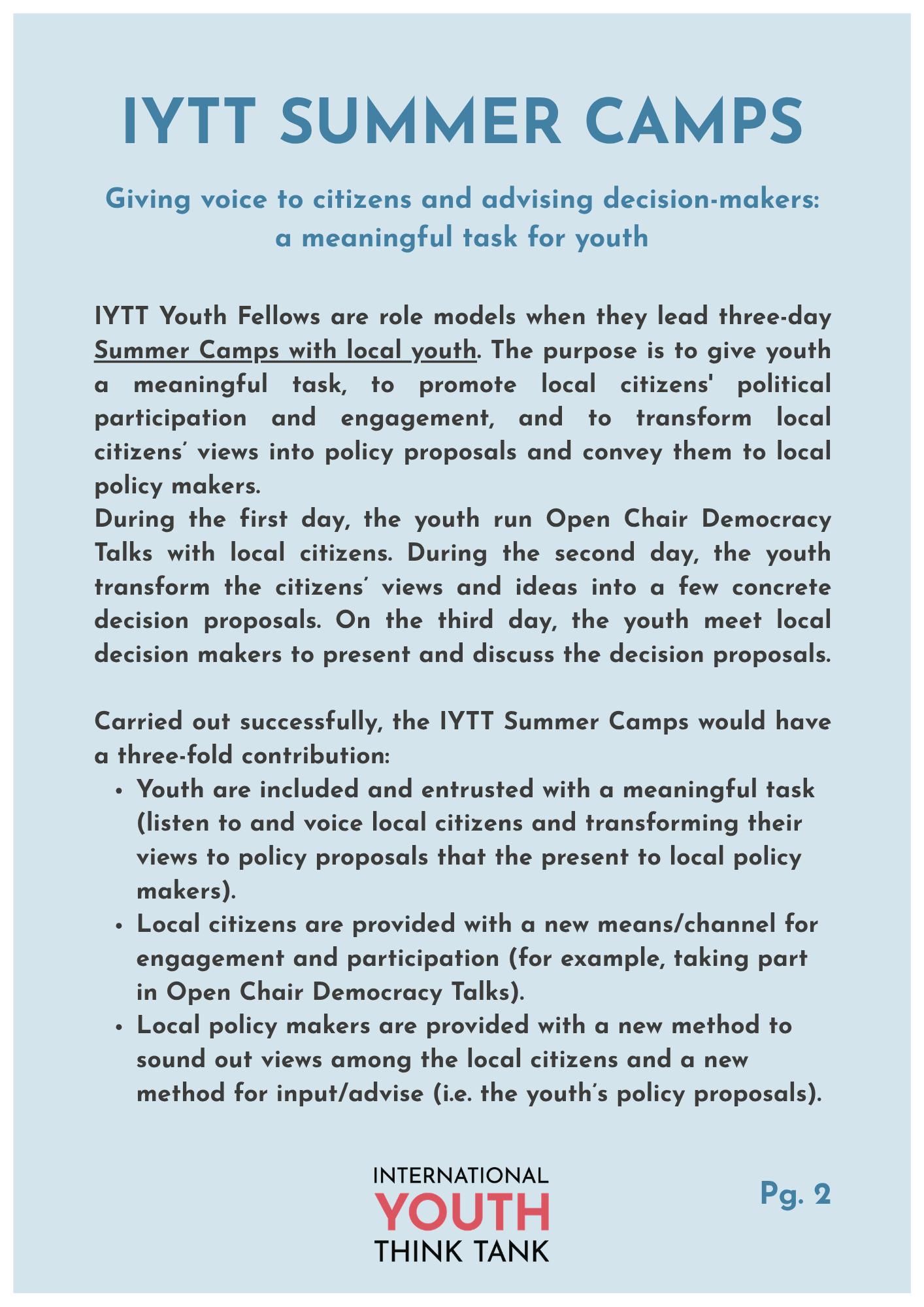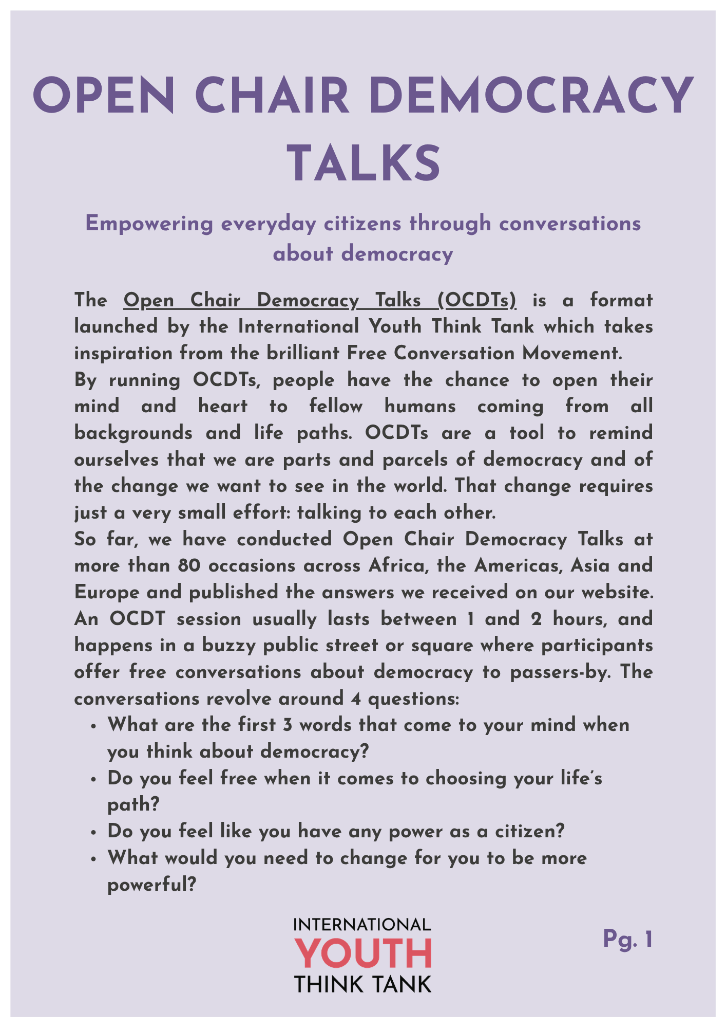 Part of the activities of the IYTT are those of a do-thank, engaging in meaningful action to foster democratic renewal and youth engagement. Thanks to our IYTT Bottom-Up Policy Advice Loop and the creativity of our Youth Fellows, we have, over the years, developed a repertoire of methods that we design and test in local communities worldwide. This is a live catalogue of these methods, available to everyone to experiment with in their local communities.